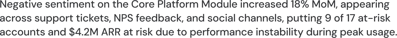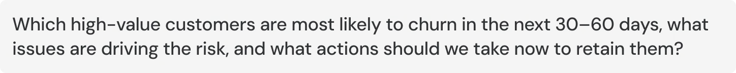 Which of our high-value customers are most likely to churn in the next 30–60 days, what exact issues across product and support are driving that risk based on cross-channel feedback, and what actions should we take immediately to retain them?